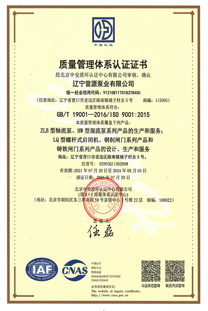 遼寧營源泵業(yè)有限公司始建于1995年,位于渤海之濱、遼河岸畔,東臨沈大高速公路、南靠營口鲅魚圈新港、北臨京沈高速公路,公司距營口高鐵站15公里距營口機場20公里,地理位置優(yōu)越,海陸空交通極為方便。公司主導(dǎo)產(chǎn)品是各種規(guī)格農(nóng)業(yè)水利及市政排污用軸流泵、混流泵、潛水軸流泵、漂浮式軸流泵、移動式泵站、集裝箱式泵站、QJ系列井用潛水電泵、螺桿式啟閉機、固定卷揚式啟閉機、平面鑄鐵閘門、中型鋼制閘門、GGD-YY型交流低壓配電柜。